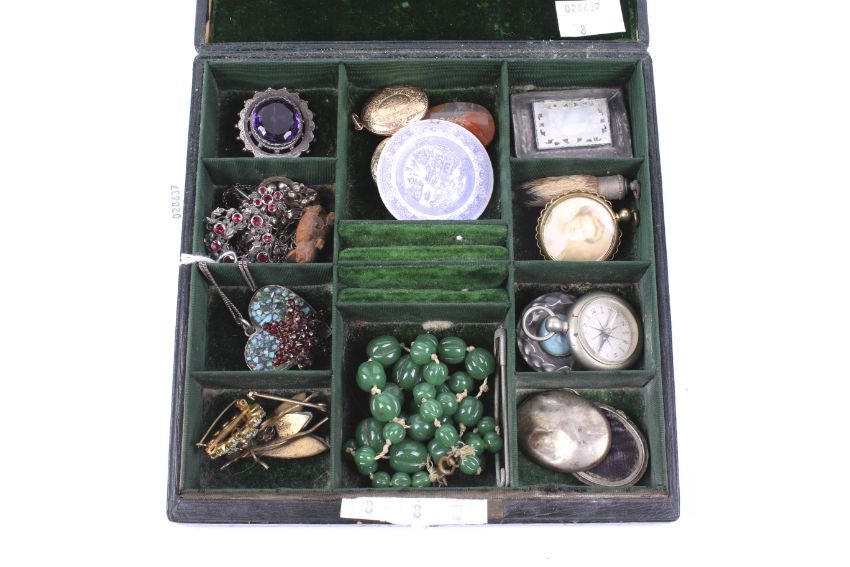 A collection of Victorian and later jewellery in a green velvet lined box. Including a Spode ceramic 'plate' shaped brooch; a turquoise brooch; a silver gem set brooch; a silver necklace and other items