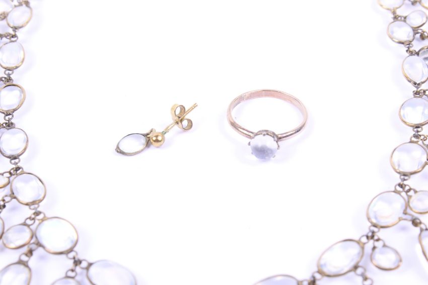 A small group of moonstone jewellery including a spectacle-set fringe necklace. In the form of a graduated oval cabochon line alternately hung with further oval cabochon swing drops and smaller round cabochons, approx. 41cm long (16 inches); together with a nine stone line bracelet, 16cm long (6 1/4 inches); a round cabochon single stone ring, indistinctly stamped '9ct', size H, 0.9g; and a single pendent earring