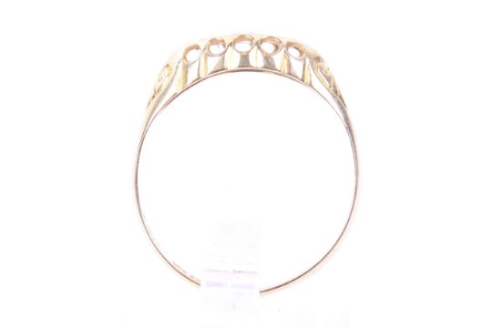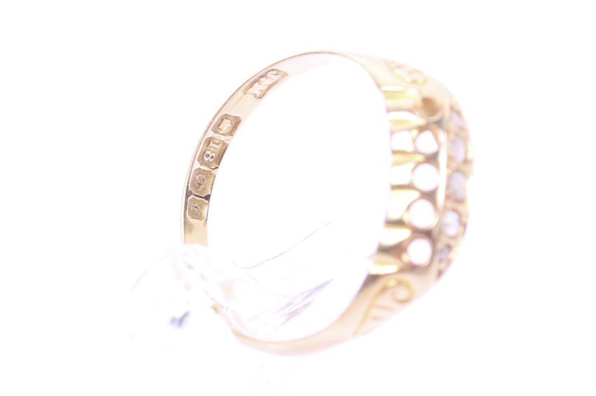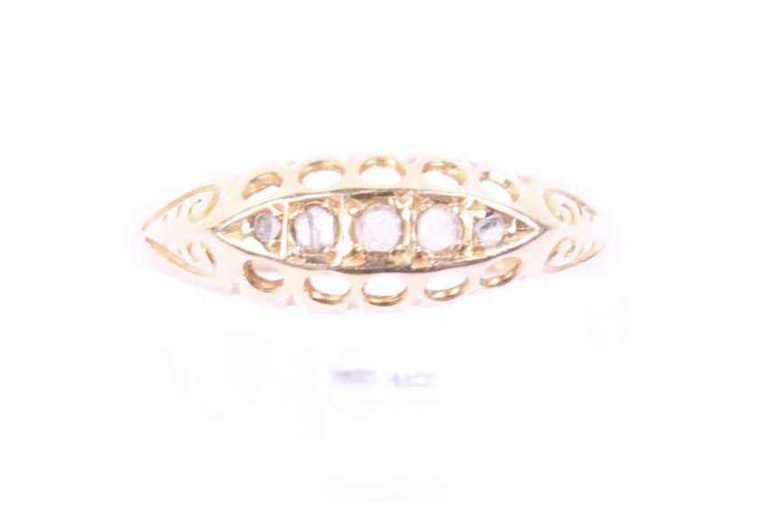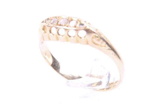 An Edwardian 18ct gold and rose diamond five stone ring. The slightly graduated stones each grain set within a lozenge-shaped panel, on a D-section shank with hallmarks for Birmingham 1905, size P+, 1.7g gross