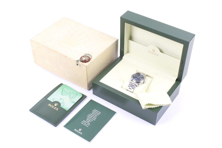 Rolex, Oysterdate Precision, a gentleman's stainless steel bracelet watch, circa 2007. Ref.116264, No.Z325822, the brushed-blue dial with raised baton indicators and hands, sweep centre seconds and a date aperture at 3, Oyster screw case with conforming reference and model numbers, and the inside back marked 2080, on an Oyster bracelet ref 557, with a deployant clasp, Rolex automatic movement Cal. 3135(?), and numbered '3 1246148 Rolex', adjusted 5 positions and temperature, together with the original Garantie(sic) hand dated '2nd August 2007' and stamped with the retailers stamp of Frazer Hart Jewellers Croydon, dark-green leatherette case and outer light-green card box