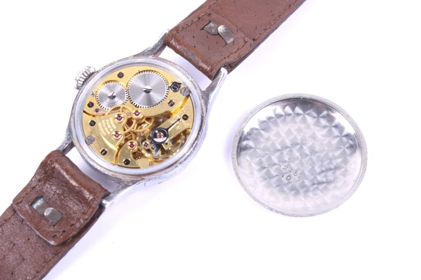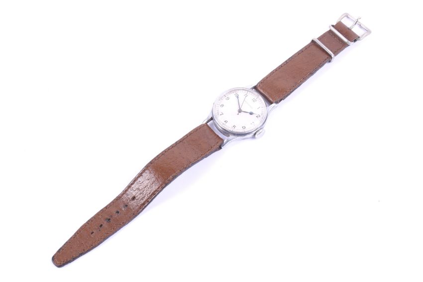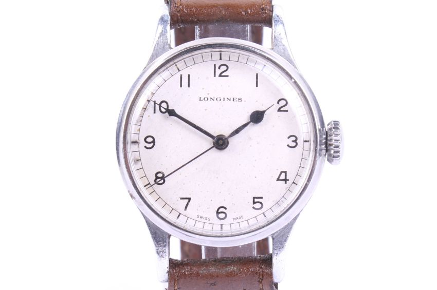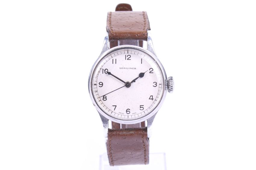 Longines, a gentleman's WWII chrome-plated and stainless steel round wrist watch, circa 1943-44. The silvered dial with black painted Arabic numerals and blued-steel sapde hands and centre seconds, the 32.5mm diameter three-piece case with flared lugs and numbered inside '22453' over '101', on a brown leather strap, Longines 16 jewel movement Cal.1268N, no.6595393; together with a Longines black leatherette case, and white outer card box. Note; Longines recent service and later replacement perspex 'glass'