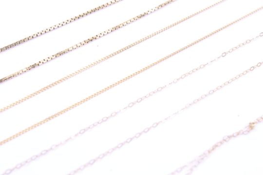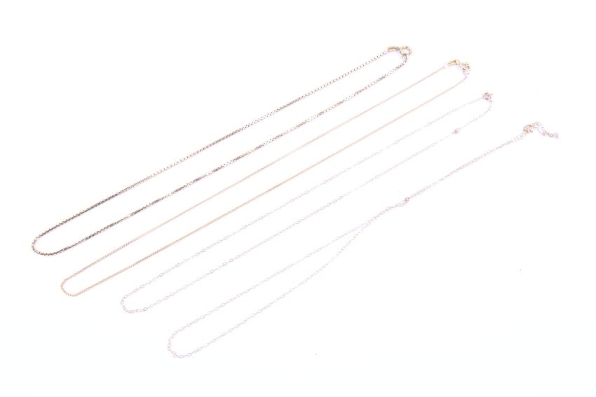 Three 9ct gold fine chains and a box link necklace. This with an Italian oval panel stamped '585', on a bolt-ring clasp stamped '333', 39.5cm long overall (15 1/2 inches), 4.1g gross; the three necklaces stamped '9k', '375' etc, 2g