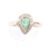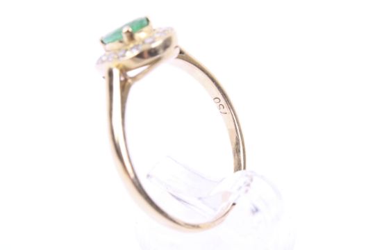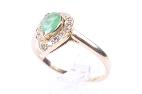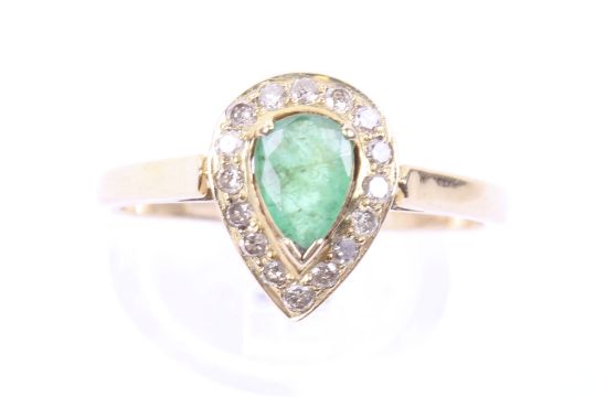 A vintage gold, emerald and diamond pear-shaped cluster ring. Centred with a pear-shaped emerald claw set within round brilliant diamond 15 stone border, on a D-section shank stamped '750, size T, 3.5g gross; together with a blue leather bound box marked 'H Hallpike, Jeweller, London'