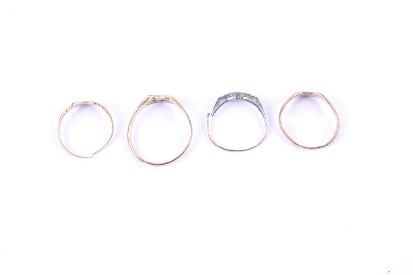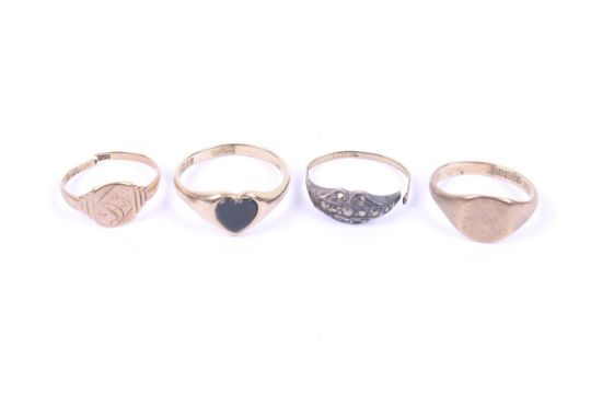 Three 9ct gold signet rings and a marcasite ring. One of the signet rings set with a bloodstone, size S, two of the rings AF, 9.4g gross