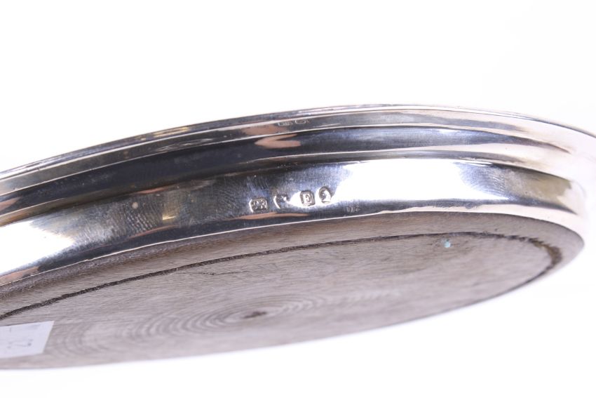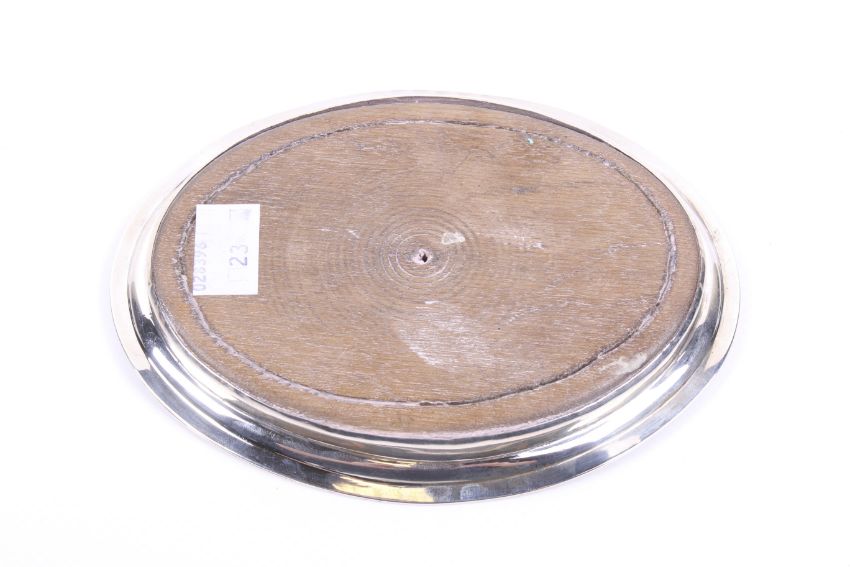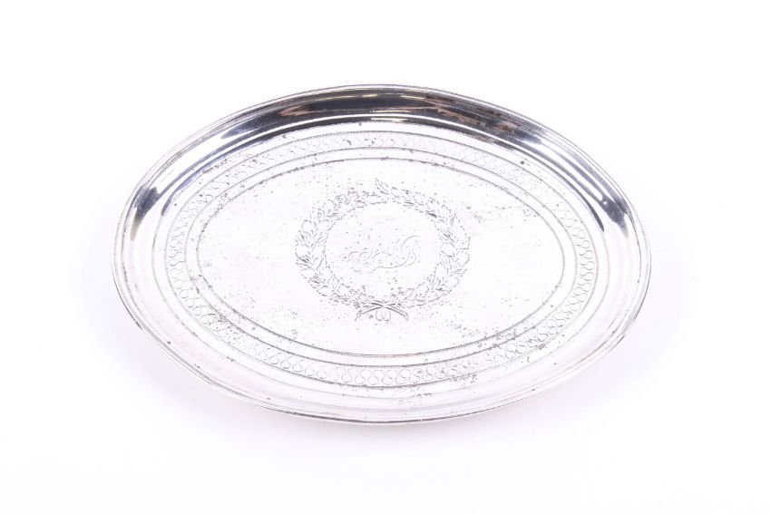 A George III silver mounted oval teapot stand. With a reeded border and engraved bands around a floral wreath cartouche enclosing script initials, marker's mark rubbed, London 1800, wood base, 16cm wide (6 1/4 inches)