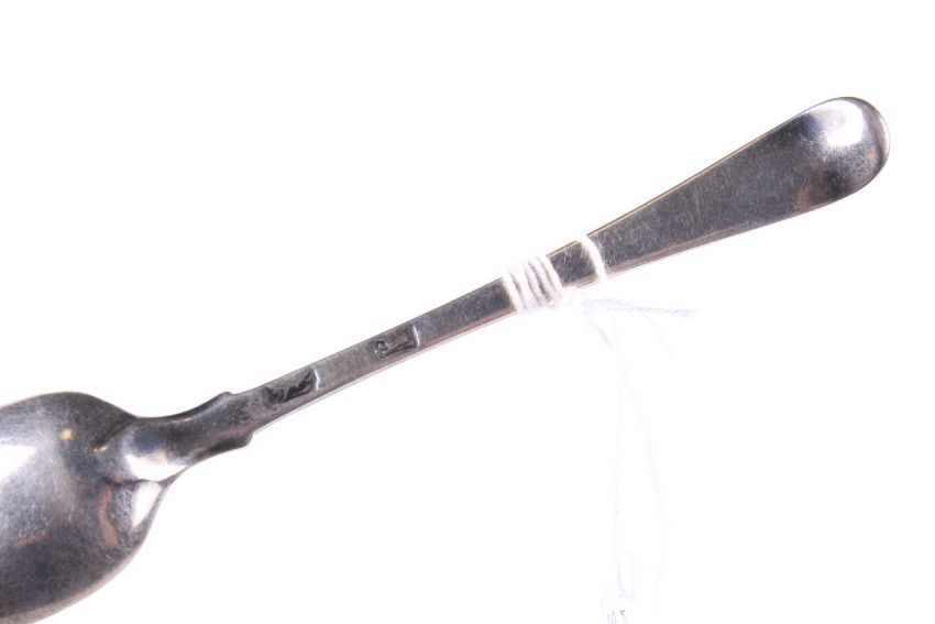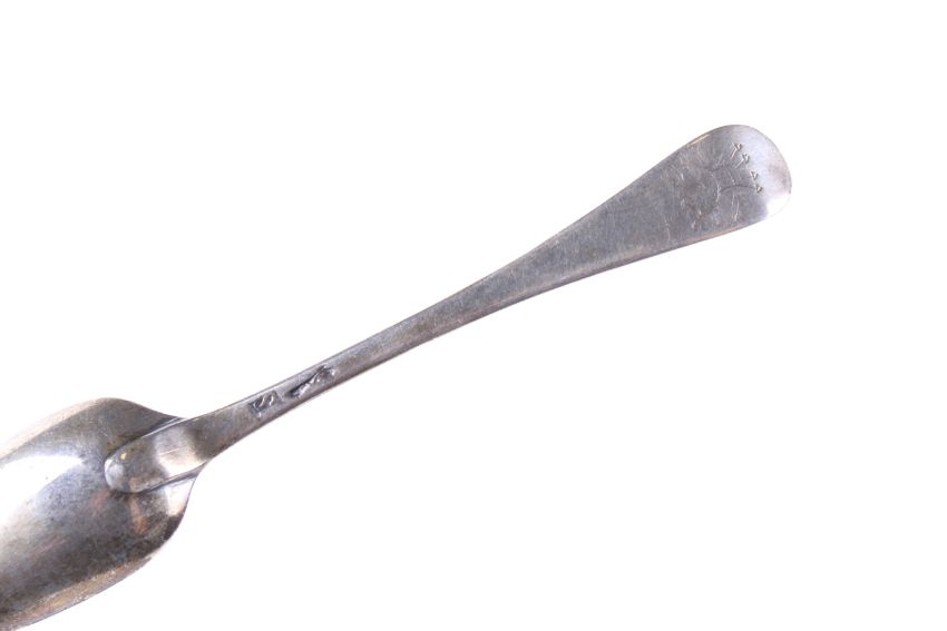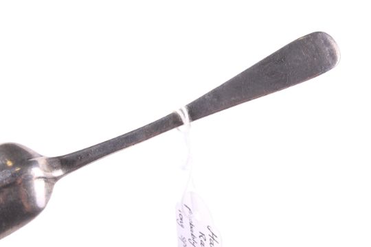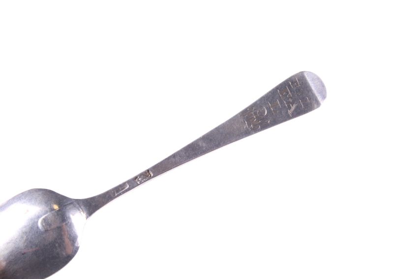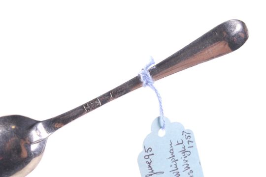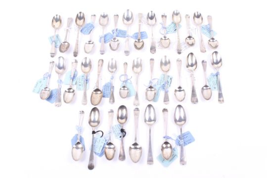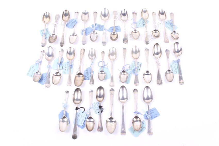 A private collection of 36 George II and later silver tea and coffee spoons. All bottom marked, many with initials or crests, each with a hand written tag detailing the date and location purchased and including three with initials 'P.L' over E*A' over 'L' over a later monogram and with the maker's mark S.A, probably that of Stephen Adams; the other various dates and makers, approx. 434g gross including the tags, please allow for the tags when bidding on this lot (approx. 13 1/2 ozs); in a green covered table top cabinet with four drawers