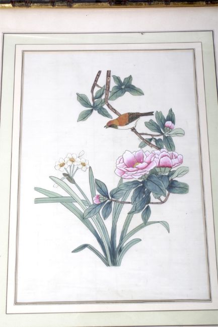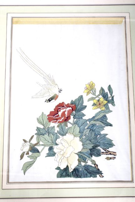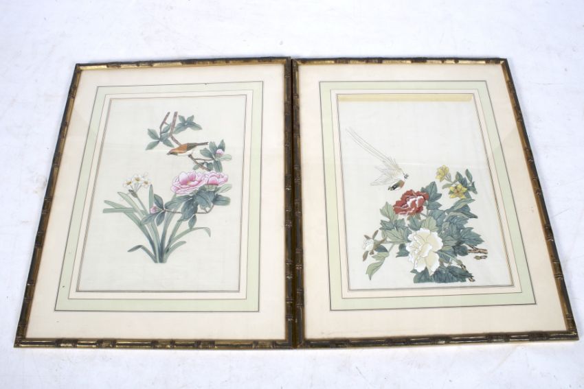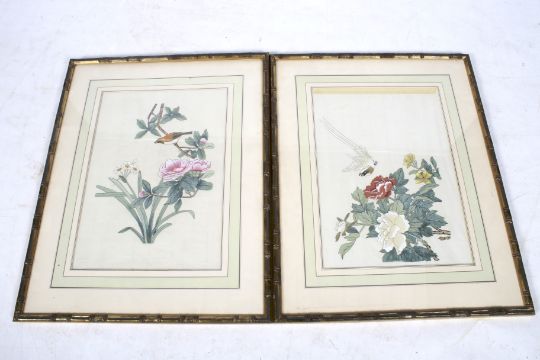 Two 19th/early 20th century Chinese paintings on silk of birds and flowers. 50cm x 35cm, framed and glazed.