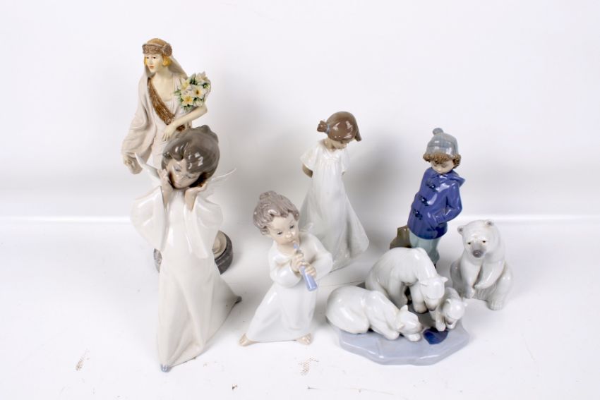 Seven porcelain figures. Comprising a Royal Doulton 'Classique' on a circular marble base, two Lladro polar bears, two Nao figures of children and two Lladro figures of cherubs, Max H28cm
