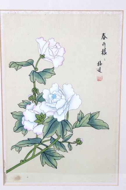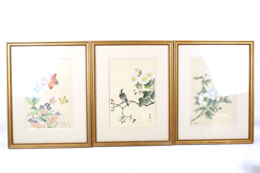 Three Chinese paintings on silk. Of various flowers with a bird and a butterfly, each signed and sealed. 30cm x 20cm, mounted, framed and glazed.