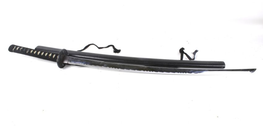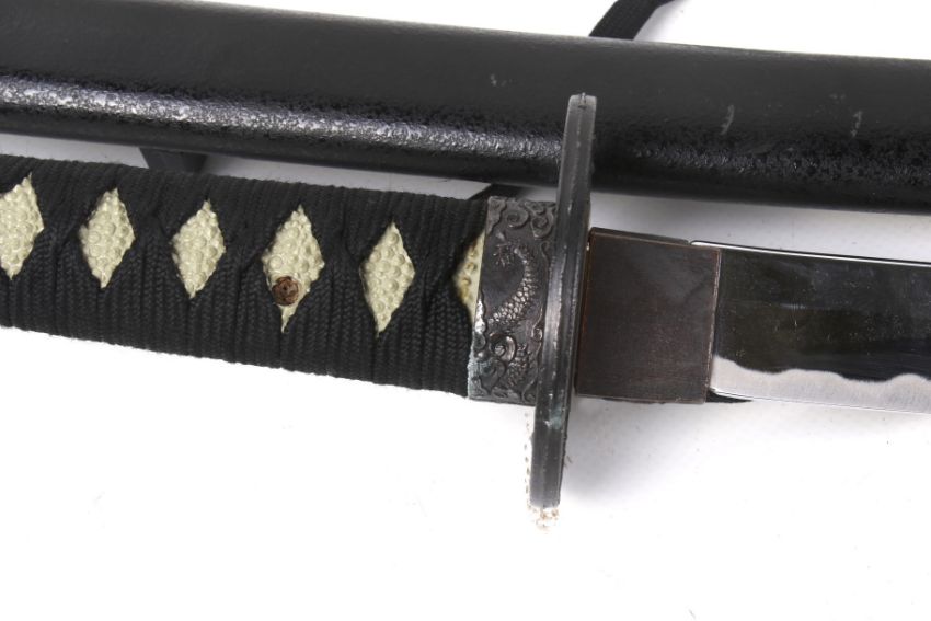 A 20th century Japanese 'Samurai' sword. Fuchi kashira, menuki and tsuba decorated with dragons, blade L70cm, in a black lacquered wood scabbard.
