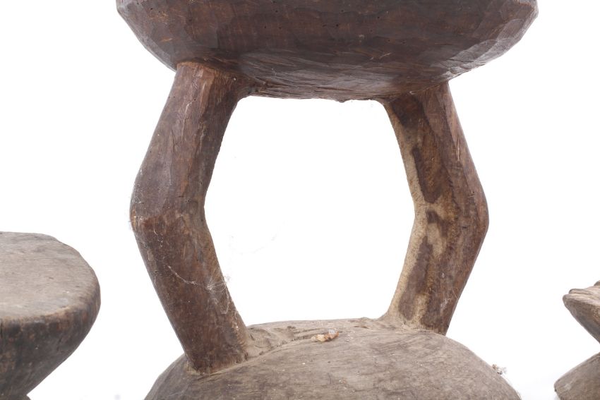 Papua New Guinea. Three wooden stools. One with out-turned opposing 'knees' between opposing hemispheres, one with short legs, the other composed of simply two opposing hemispheres. Largest H28cm.Lots 1-58 in this auction are all from the same collection, the majority of which was collected in Papua New Guinea in the 1970s and 1980s.