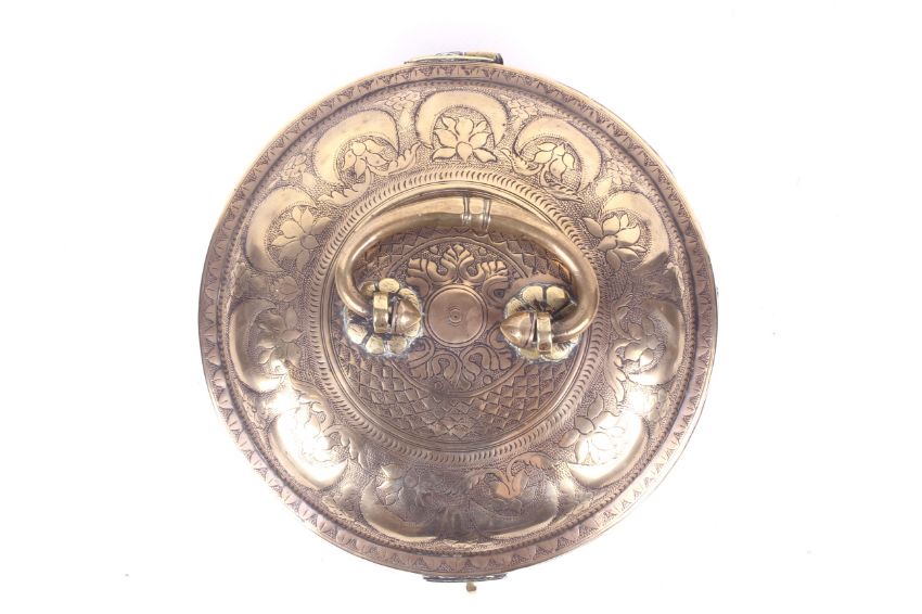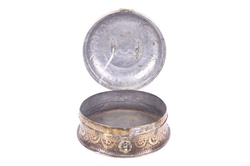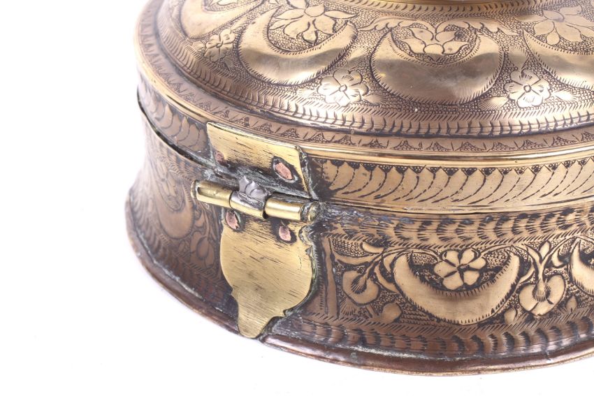 A Middle Eastern brass spice box. Of circular form with a handle to the hinged lid, decorated with lotus and crescents. Diameter 21.8cm.