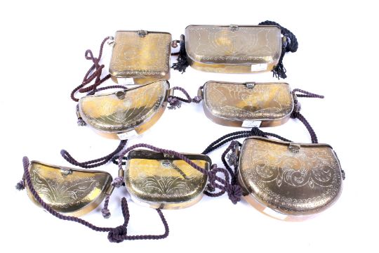 A set of seven Kuwaiti brass purses / containers. Various sizes, Max H11cm