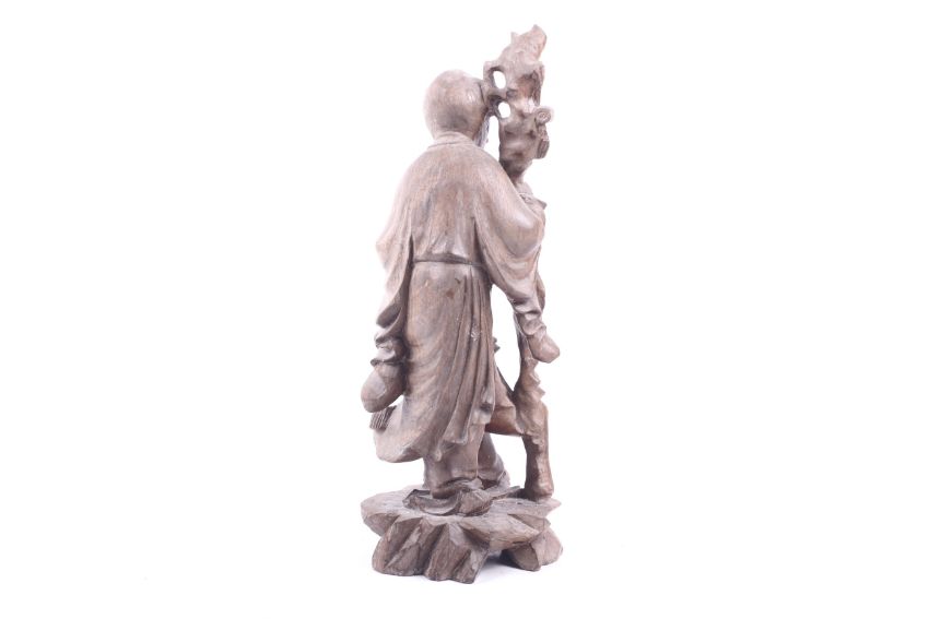 A Chinese hardwood carving of an old man. Carrying prayer beads in his left hand and a gnarled staff in his right, standing on a pierced rocky base. H26.5cm.