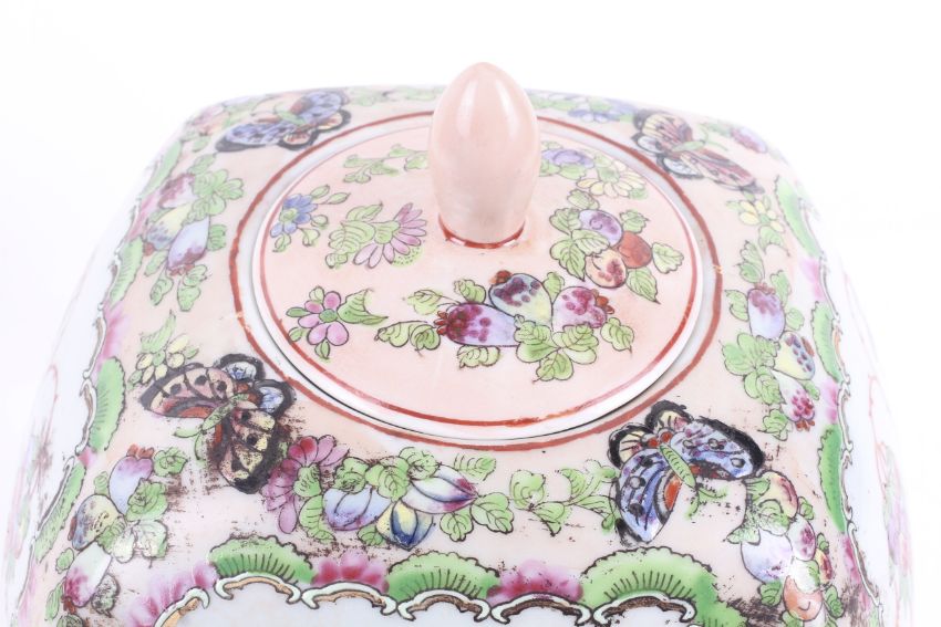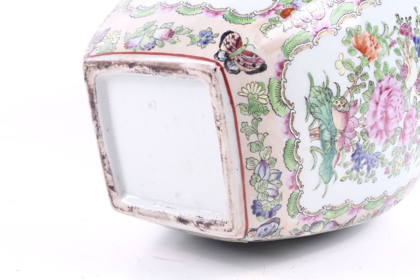 An early 20th century Chinese square form lidded vase. Decorated with reserves of cockerel and a basket of flowers against a pale pink ground. H25cm.