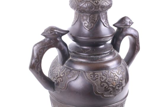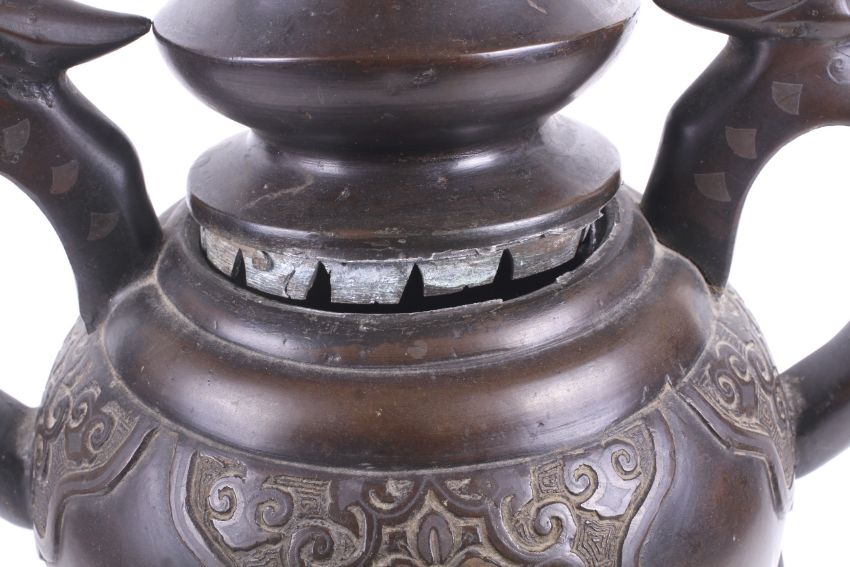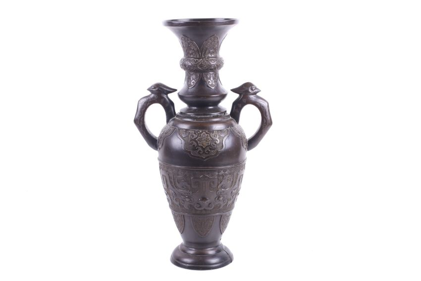 An early 20th century large Japanese inlaid bronze urn. With two bird or phoenix headed shaped handles, the neck and body with panels and cartouches of scrolls and taotie masks on diaper grounds, over a stepped spread foot. H59cm. In two parts.