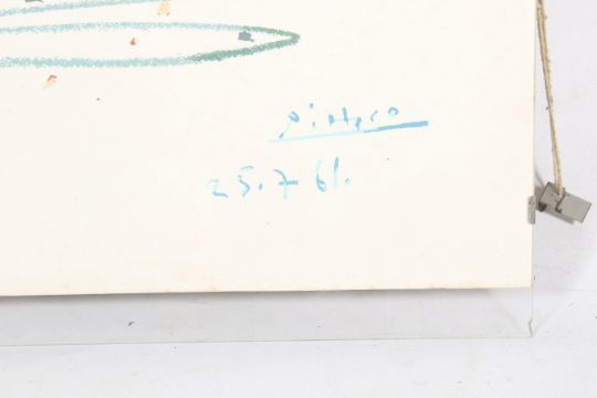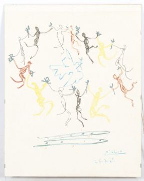 After a drawing from 1961 by Pablo Picasso, polychrome print 'The Dance of the Youth', on handmade paper. 60cm x 48cm, mounted and glazed