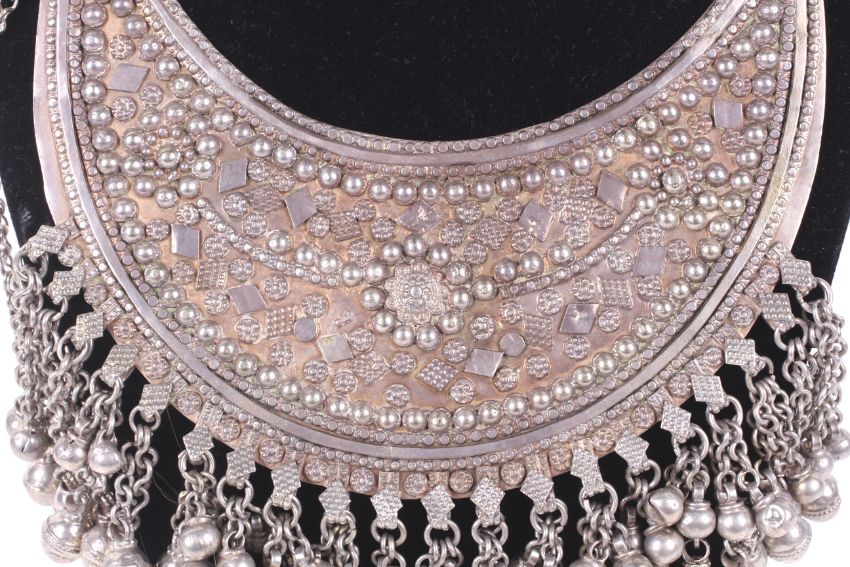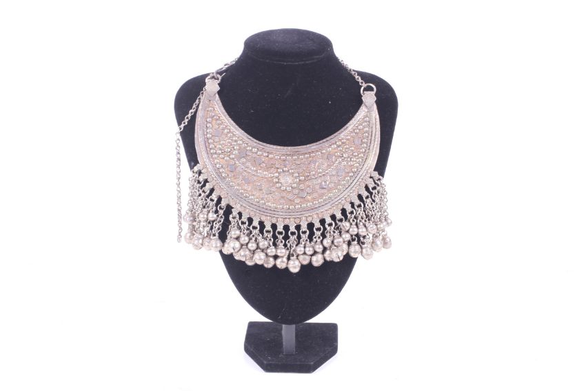 An Indian white metal necklace. The crescent panel with applied patterns of textured and flat shapes, the lower edge adorned with numerous small bells. Circa W16.5cm.