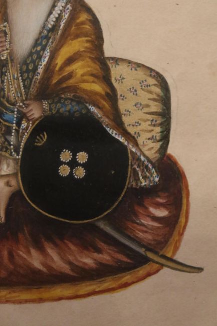 A pair of 19th/early 20th century Indian paintings on paper of Sikh commanders. Both depicted seated and holding weapons. 13.5cm x 11cm, framed and glazed.