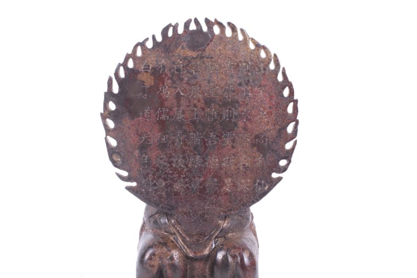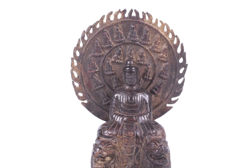 A Tibetan bronze figure of the Buddha Amitabha seated on a pair of lions. The Buddha framed by a mandorla with two circles of seated buddhas, a six-line inscription to the verso. Remains of gilding, H27.2cm