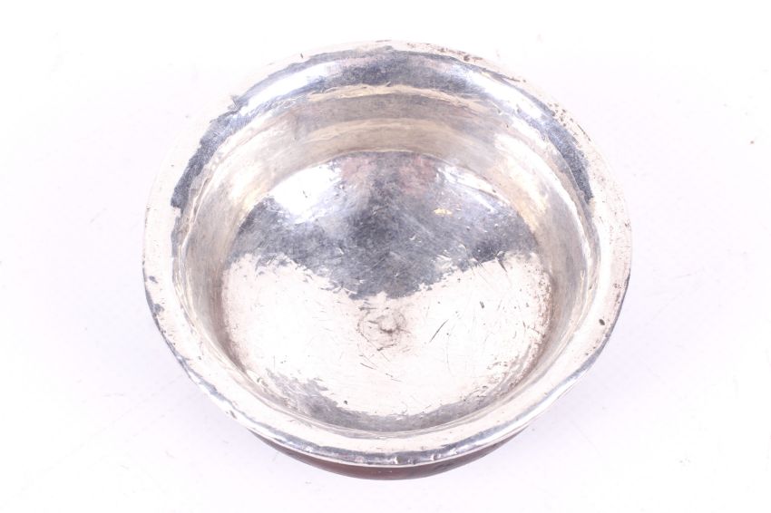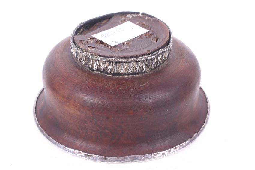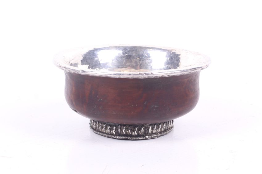A late 19th/20th century Tibetan white metal and burl wood ceremonial tea bowl. Of traditional form, lined with white metal with repoussé band to the footrim. Diameter 9.9cm.