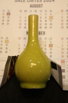 Three 19th/20th century Chinese vases. Comprising a famille verte vase decorated with horse and qilin, fu (good luck) mark to base, H20cm, miniature vase with craquelure yellow vase, H9.3cm, and a vivid yellow vase with unglazed cicada applied motifs, H20.5cm. Condition Report: Famille verte vase - appears in an excellant condition for its age, no chips, cracks or restoration.Miniature vase - appears in a very good condition for its age, the glaze is crazed, no chips, cracks or restoration, the rim is a little rough to the touch around the outside of the rim.Large yellow - appears good for its age, the glaze is crazed, there are three small chips around the rim, no cracks or restoration, there are firing faults