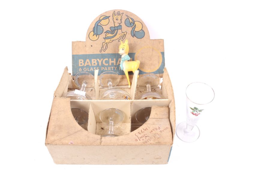 A boxed set of six Babycham glasses. Labelled 'Babycham Party Pack'