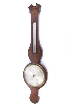 A 19th century mahogany framed wheel barometer. The case with a turned wooden finial and inlaid marquetry decoration featuring flowers and shells, a mercury thermometer positioned over the silvered engraved dial by 'A. Rivolta'. H98cm