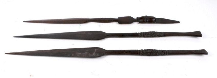 Three African wood spear heads. One carved with a head, the other with rows of lines. Largest L74cm.
