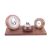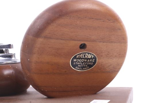 A mid-century Ryecraft Woodware desk set. Consisting of an aneroid barometer, a thermometer and a table lighter. H12cm