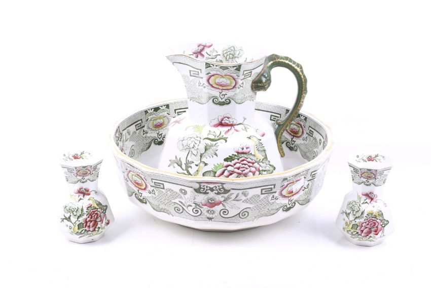 A Victorian Masons wash set. Comprising a jug, basin and two small vases, decorated with a printed green floral pattern with hand painted decoration and a snake handle, jug H27cm