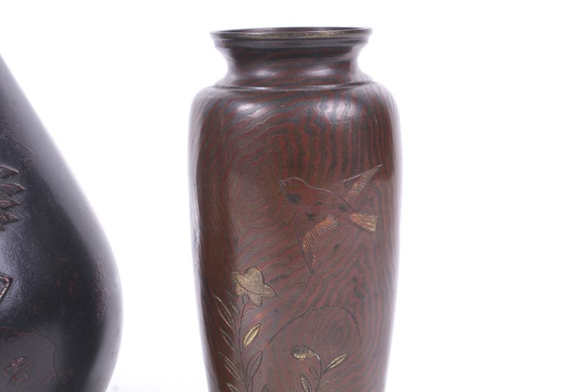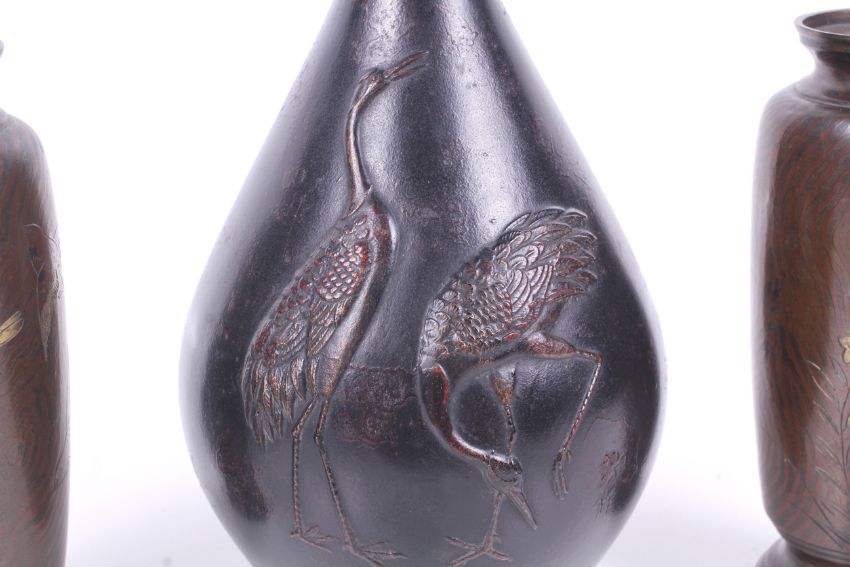 A pair of small bronze Japanese Meiji period vases and a further vase with cranes. The first with mixed metal decoration of woodgrain (mokume-gane) and birds flying over flowers, H13.5cm, the second with a red and black lacquer finish with a pair of cranes in relief, two character signature to body, H17.8cm