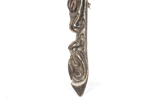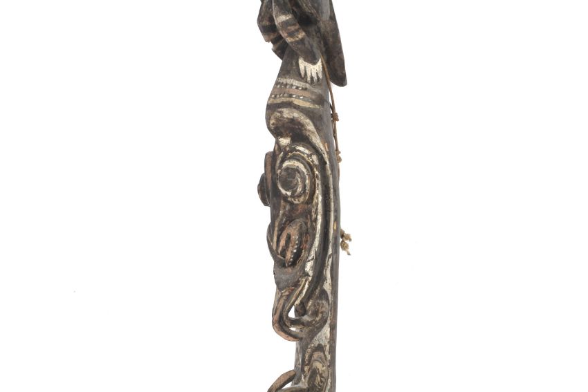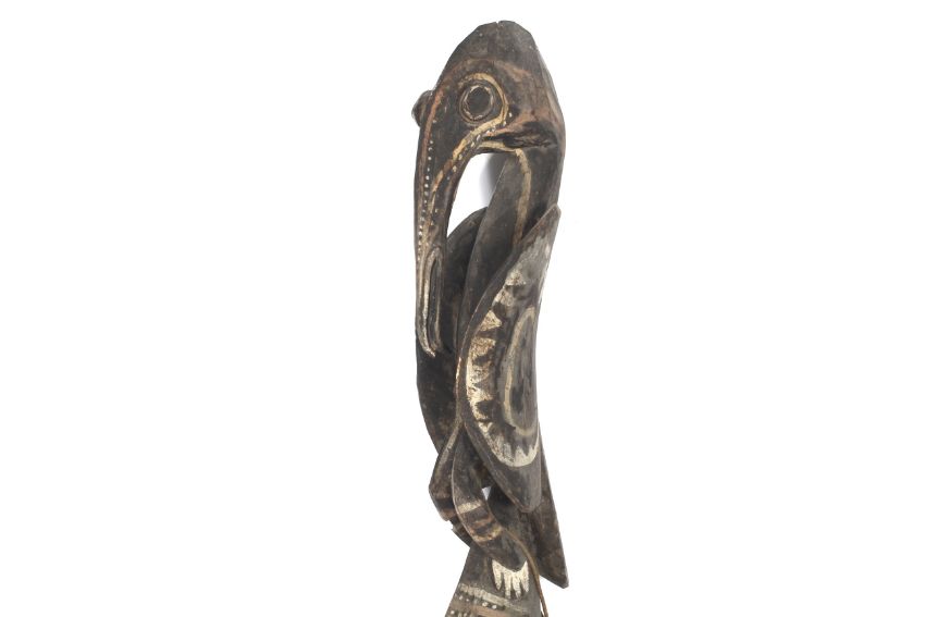 Papua New Guinea. A large carved and painted wood totem mask. With a bird-like figure with protruding eyes to the top, perched over two further masks. H152cm.Lots 1-58 in this auction are all from the same collection, the majority of which was collected in Papua New Guinea in the 1970s and 1980s.