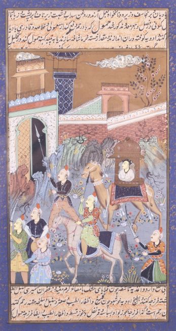 A Persian manuscript watercolour drawing. Text divided by a watercolour scene showing warriors, one riding on horse back and a camel carrying a howda, 12cm x 23cm. Framed and glazed.