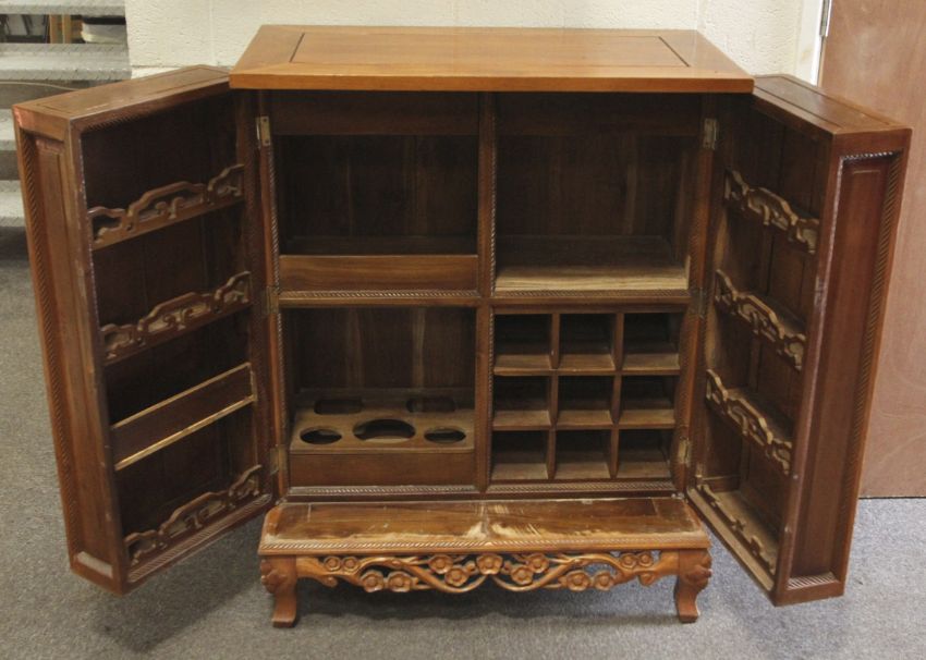 A contemporary Chinese style wooden drinks cabinet. Two doors opening to reveal a fitted interior for bottles and glasses. L80cm x D44cm x H100cm