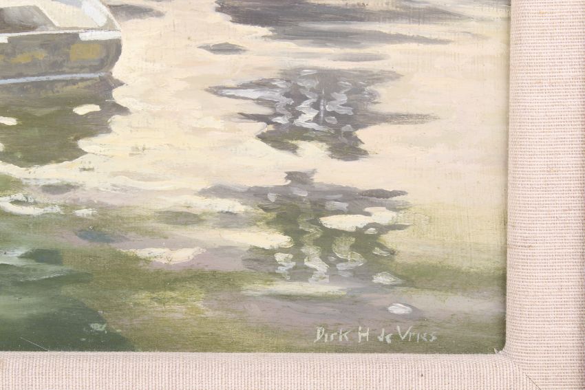 Dirk H De Vries, oil on board, 'Fowey, Cornwall, Town Quay at High Tide'. Depicting a river scene, signed lower right, information verso, 39.5cm x 50cm, framed