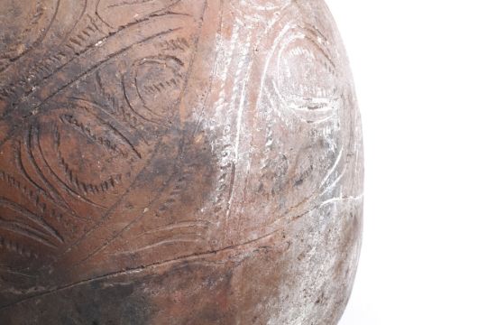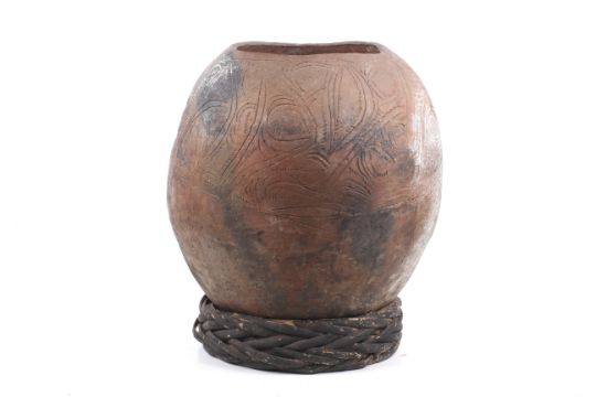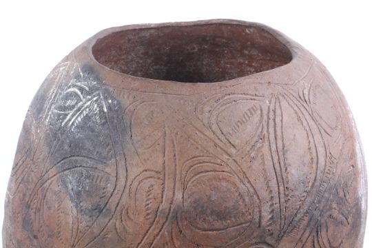 Papua New Guinea. A large rounded earthenware pot. With small opening, with incised decoration within borders to the upper half. Circa H50cm. Lots 1-58 in this auction are all from the same collection, the majority of which was collected in Papua New Guinea in the 1970s and 1980s.