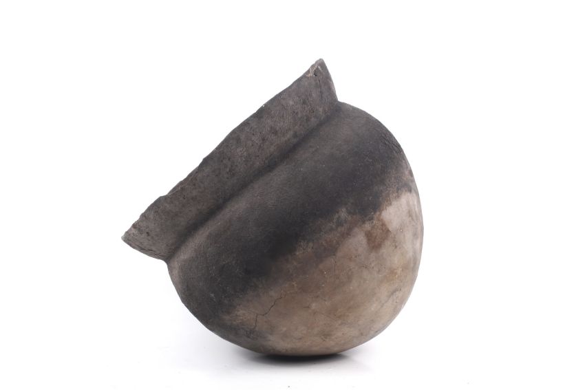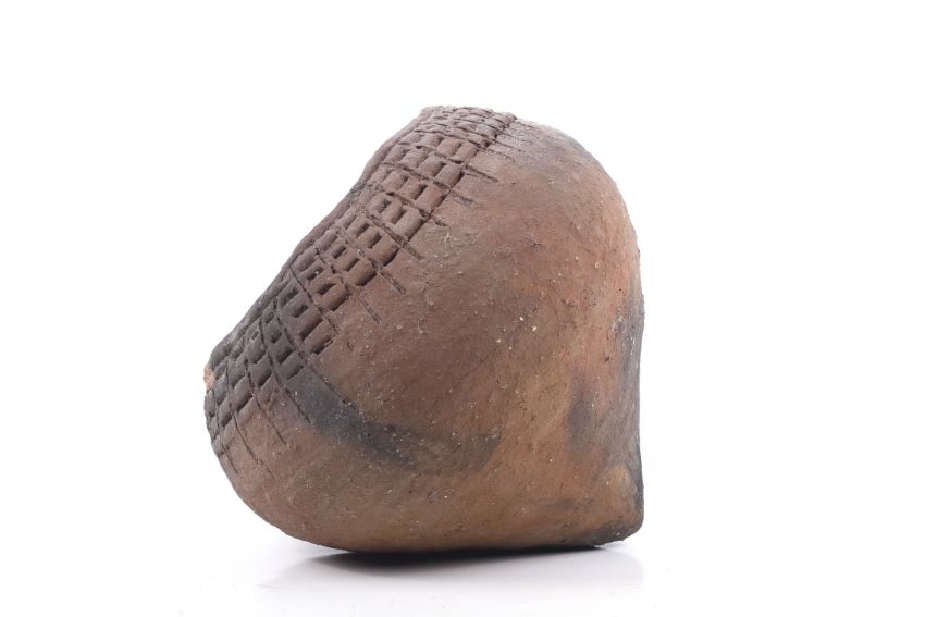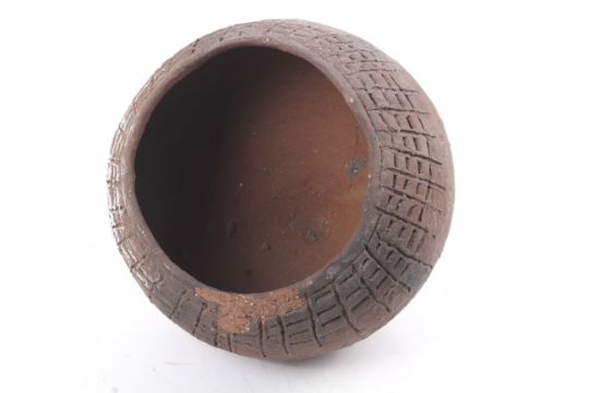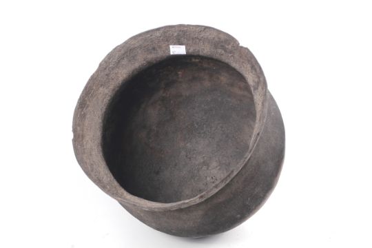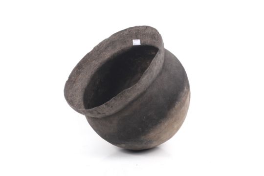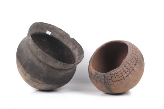 Papua New Guinea. An earthenware cooking pot and a red example. The first with upturned lip, blackened to the upper half, undecorated, circa H24cm, the second with carved rows of decoration below the rim, cracked.Lots 1-58 in this auction are all from the same collection, the majority of which was collected in Papua New Guinea in the 1970s and 1980s.