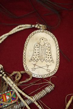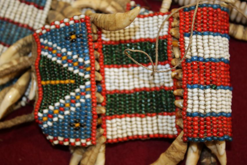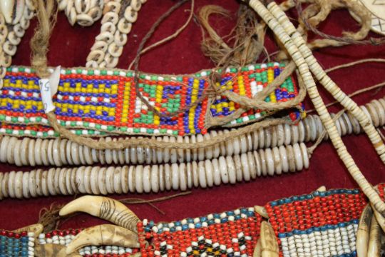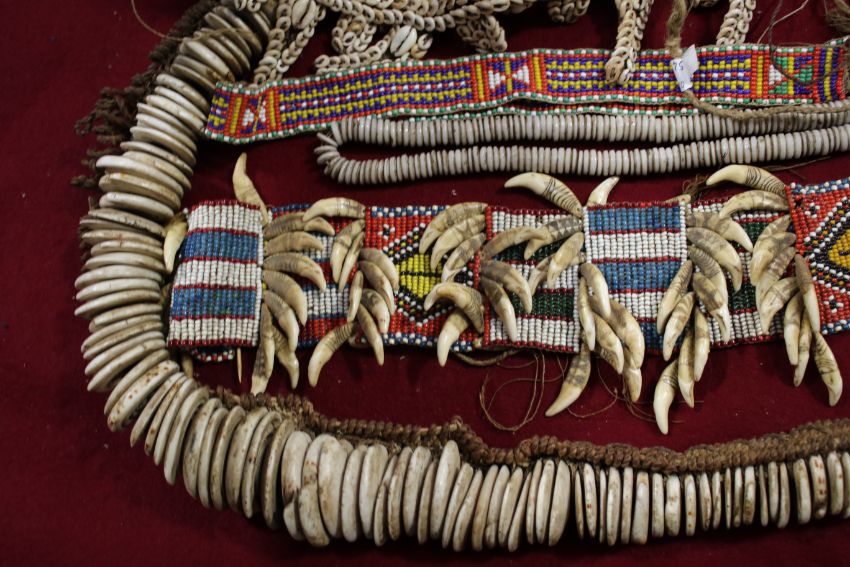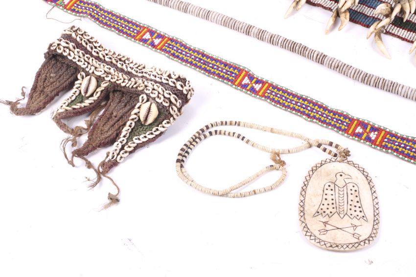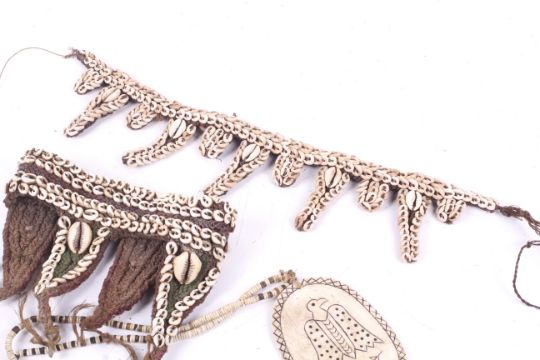 Papua New Guinea. A group of bead, bone and shell adornments. Including a wide beaded hanging adorned with carved animal teeth, a woven piece decorated with shells, etc.Lots 1-58 in this auction are all from the same collection, the majority of which was collected in Papua New Guinea in the 1970s and 1980s.