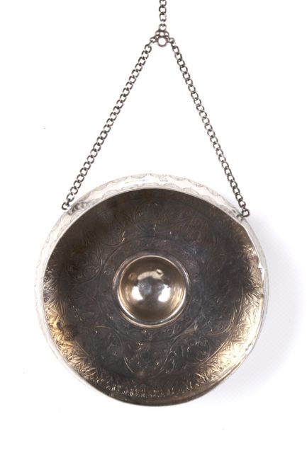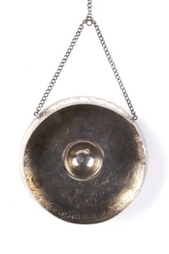 A Persian gong, probably silver. Engraved with scrolling vines and flowers, marked H.T and additional Persian maker's mark. Diameter 15cm, weight 186g.