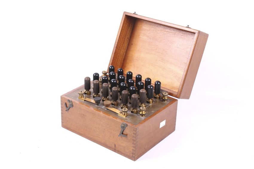 A Gambrell London vintage Wheatstone resistance bridge. Having multiple knobs and levers, within a mahogany lidded box, L25.5cm