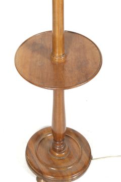 A 20th century walnut standard lamp. Having a wine table, mounted on a circular base with feet. H140cm (excluding fitting)