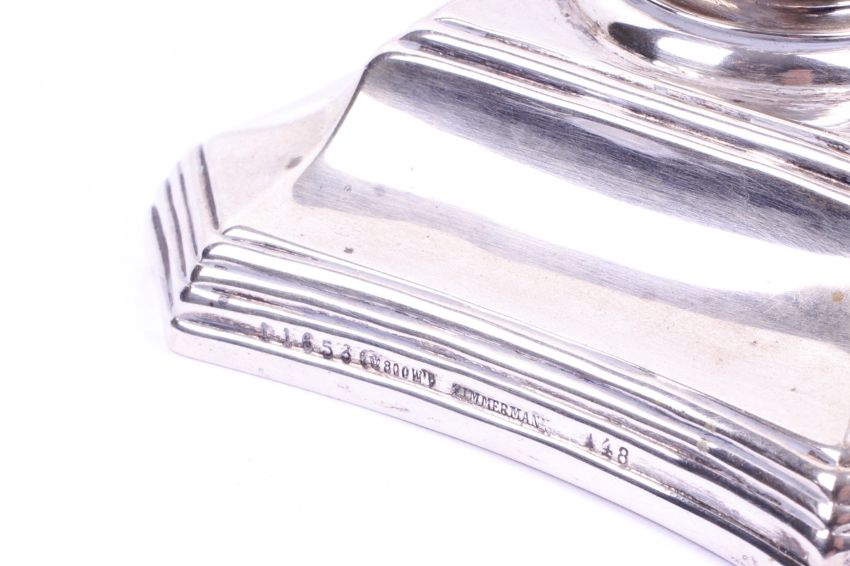 A pair of German '800 silver Zimmerman weighted candlesticks. Of Corinthian column form on a stepped base. H14.5cm. Weight 454.9g.