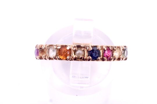 A yellow metal dress ring. Set with eight round faceted stones including a natural sapphire, a natural ruby and a cultured pearl. Four further stones assessed as synthetic, one stone absent. Metal not marked, tested as approximately 18ct gold. Size N/O, 2.9g gross