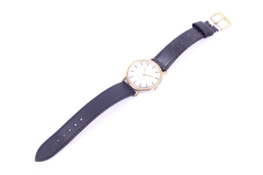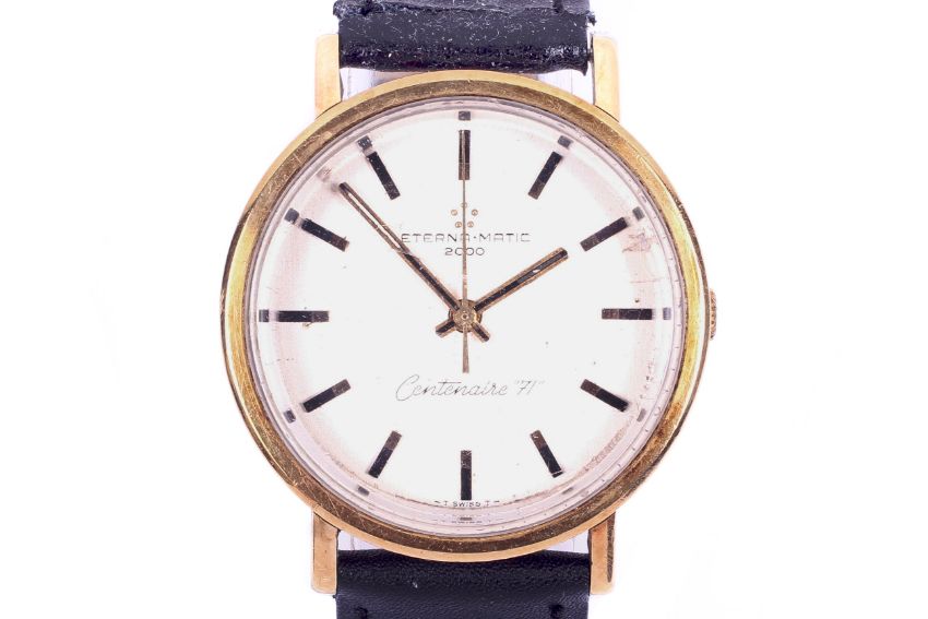 A Gentleman's Eternamatic 2000 Centenaire 71 wristwatch. Automatic movement. The silvered dial having baton hour markers and a date aperture, in a gold plated case, case diameter 35mm. On a black leather strap with gold plated buckle