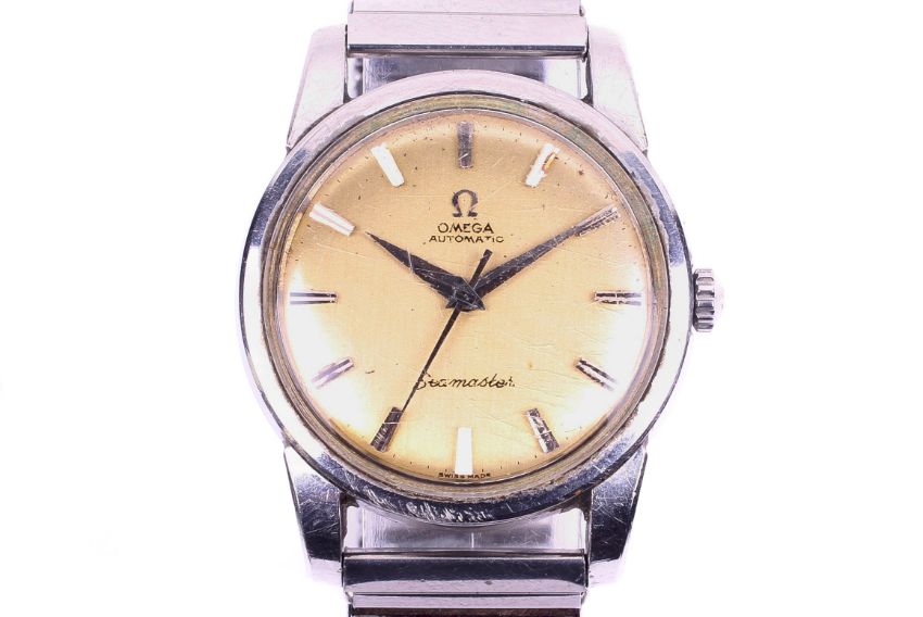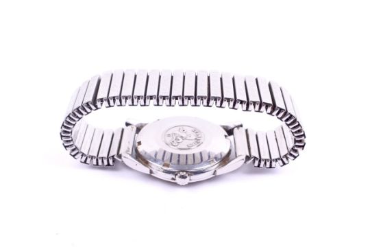 A vintage Omega Seamaster gentlemans watch. Automatic movement, the gilt dial having baton hour markers, diameter 33mm, on a stainless steel Prima-Flex strap