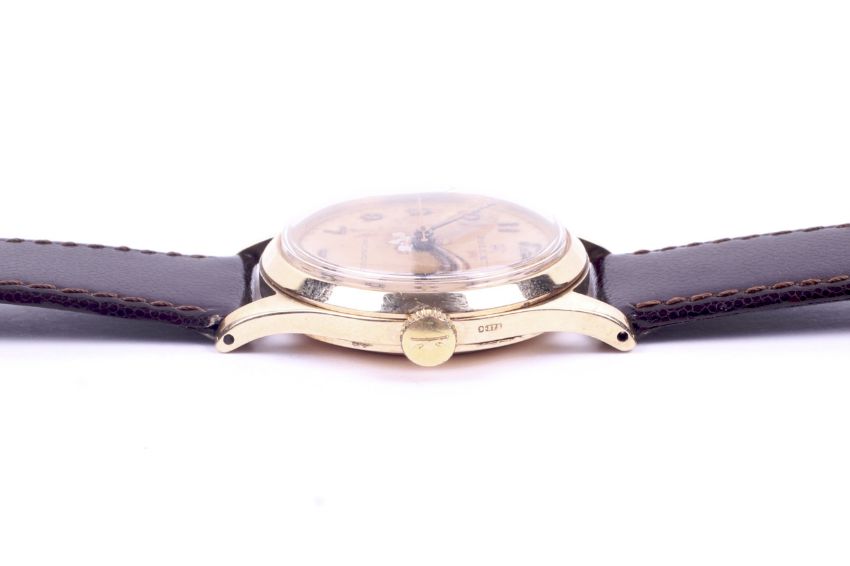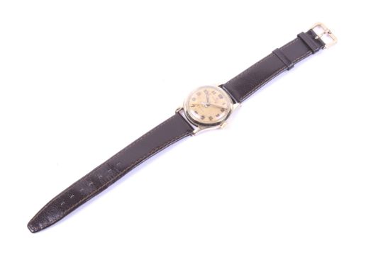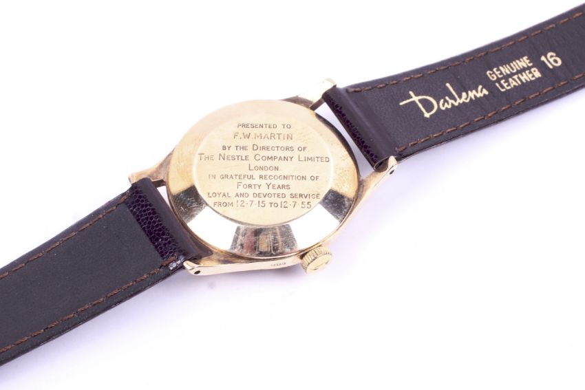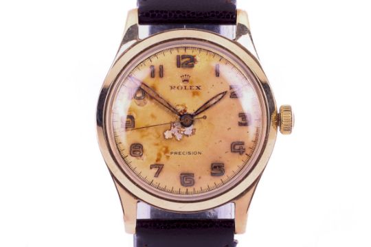 Rolex, Precision, a gentleman's 9ct gold cased wrist watch, circa 1950s. The cream dial with gilt Arabic numerals and hands, the case back engraved with the inscription 'Presented to F. W. Martin by the Directors of The Nestle Company Limited, London, in recognition of forty years loyal and devoted service from 12.7.15 to 12.7.55', the 32mm diameter case stamped '.375', on a brown leather strap with a gold-plated buckle, the movement not examined Condition Report: We do not guarantee any watch for accuracy.