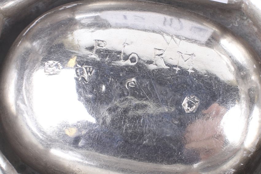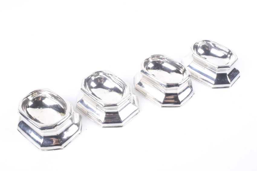 A set of four early George II silver canted-rectangular 'trencher' salts. Each with a moulded rim, two engraved beneath 'P to 'W' over 'R*M' or 'R.M', and two engraved 'K' over 'I M', mark of Edward Wood, London 1733, each measures approx. 3cm x 7.5cm x 6cm (1 1/4 x 3 x 2 3/8ths inches), the four weigh 178g (a little under 5 3/4 ozs) Condition Report: All four are hallmarked London 1733 and the maker's mark is the same, the marks are variable in the way they have been struck, i.e. in slightly different places and spacings as expected, and the date letter S on one is missing about half of it. Overall they are in good condition for their age, general wear and tear commensurate with tabloe salts that have been well used over almost 300 years. One has a shalllow dent from the back into the bottom of the bowl. No current slpits though one does have signs of an old repair to one angle.