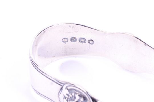 An 1836 silver sugar tongs and a pair of silver salts. The sugar tongs with shell motif to the spoons, hallmarks for London 1836, maker's marks possibly I& DE (?); the salts with hallmarks for Josiah Williams & Co, Exeter 1869, with blue glass liners. Silver weight 155g.