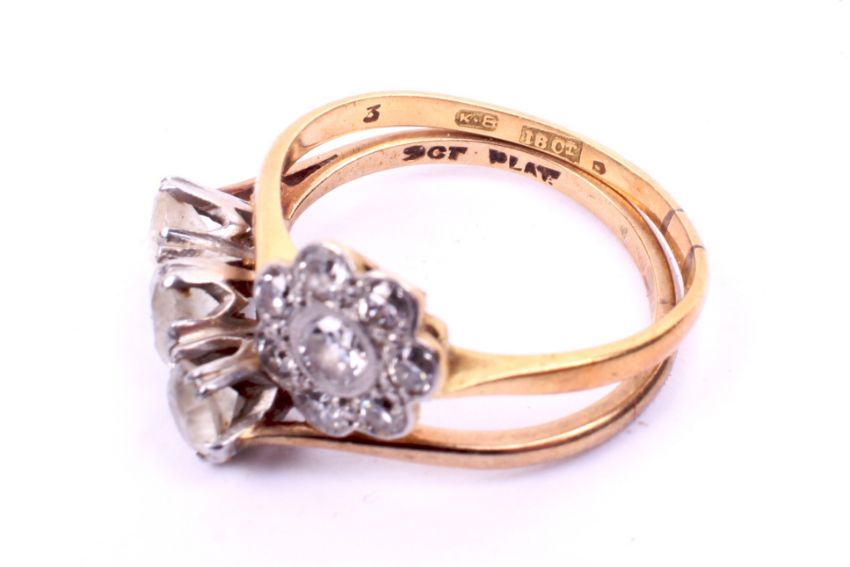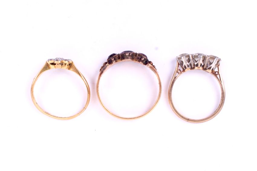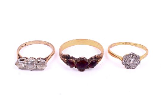Three 20th century yellow and white metal gemstone rings. Comprising a cluster ring set with old brilliant and round brilliant cut diamonds of 0.44 carats estimated total weight. Stamped '18ct', tested as 18ct gold, size L, 1.8g gross. A three stone ring marked '9ct' and 'Plat' and set with three synthetic white stones, size K/L, 2.2g gross and a yellow metal ring set with three round faceted garnet cabochons, size Q/R, 3.2g gross